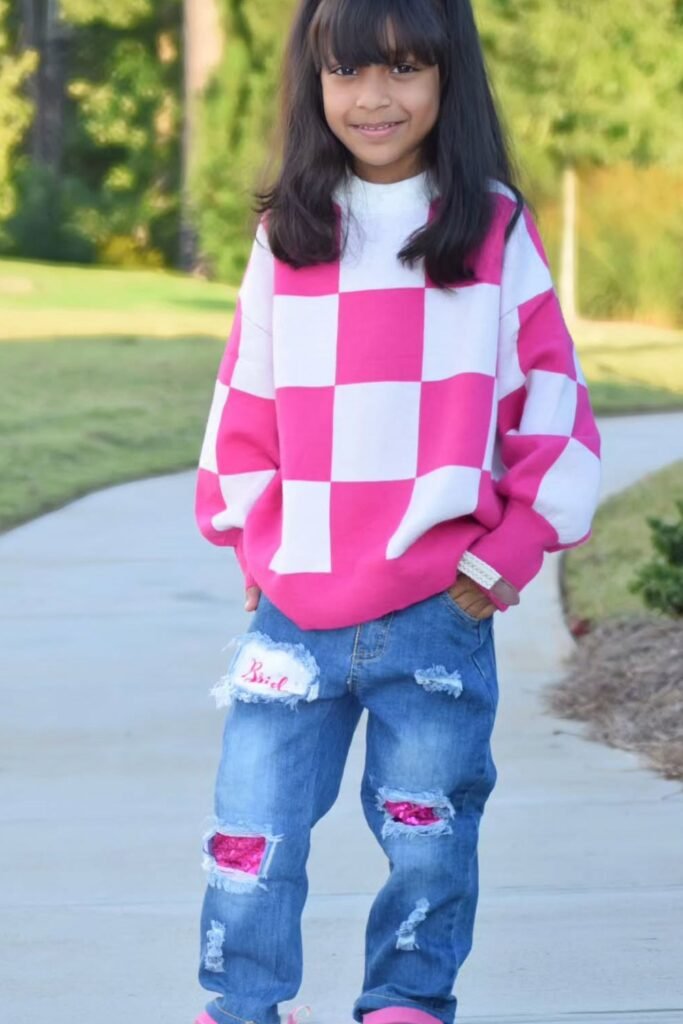 Description: This outfit is playful and full of personality. A trendy pink and white checkered sweatshirt takes center stage. It’s paired with cool distressed blue jeans that have fun pink patches, creating a coordinated look. Pink sneakers tie the whole outfit together with a pop of matching color.