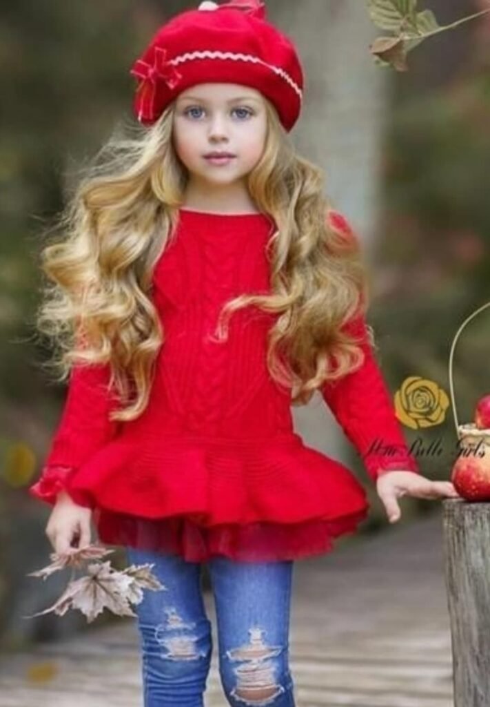 Description: This outfit is effortlessly chic with a French flair. A beautiful red knit peplum sweater adds a special, feminine touch. It’s paired with trendy distressed blue jeans for a balanced look, and a red beret with a bow provides the perfect, polished finishing touch.