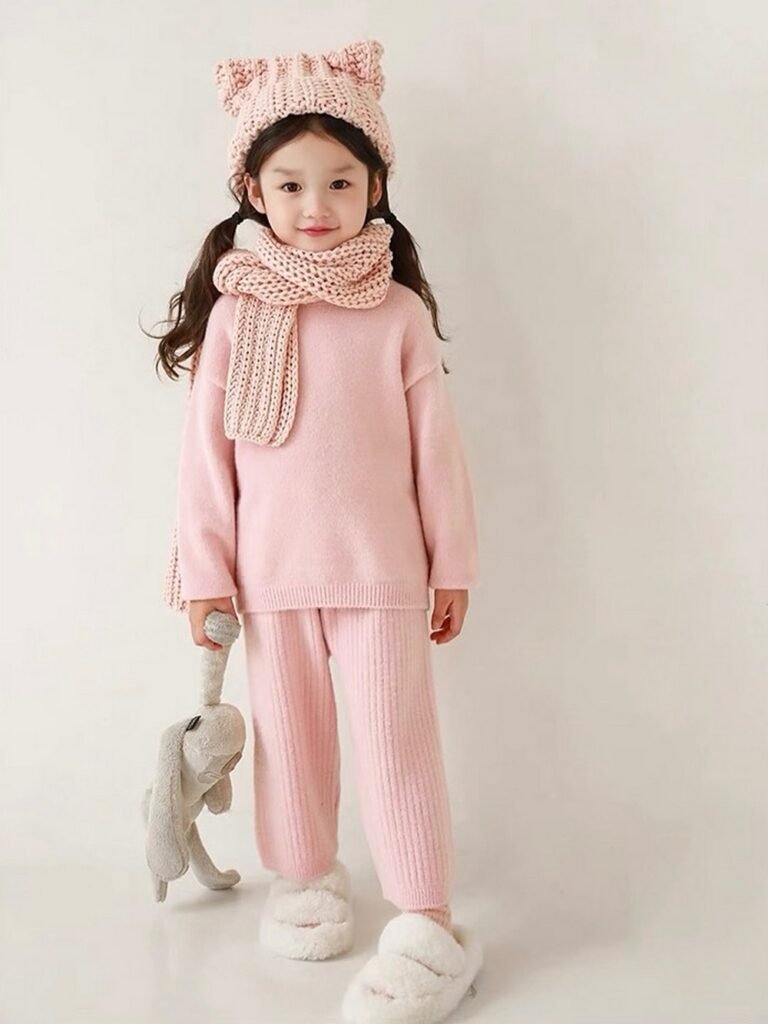 24. Soft Pink Knit Sweater + Matching Ribbed Pants + Pink Knit Cat-Ear Hat + Matching Knit Scarf + Fluffy White Slippers