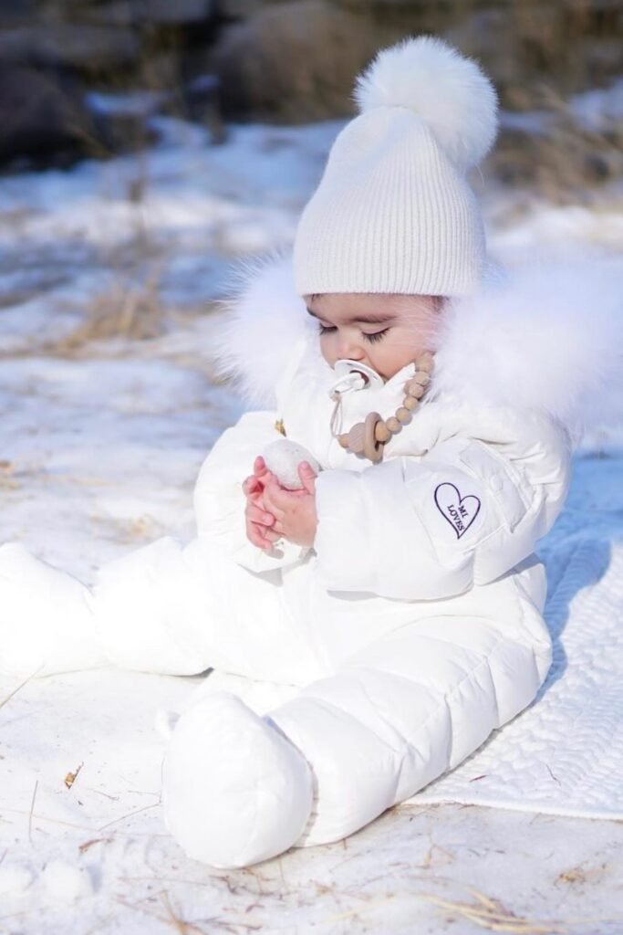 Description: This is the warmest and most practical outfit for a baby or toddler in deep winter. A one-piece white puffer suit provides all-over, can’t-escape-the-warmth coverage. A matching white hat and cozy booties keep every inch protected from the cold.