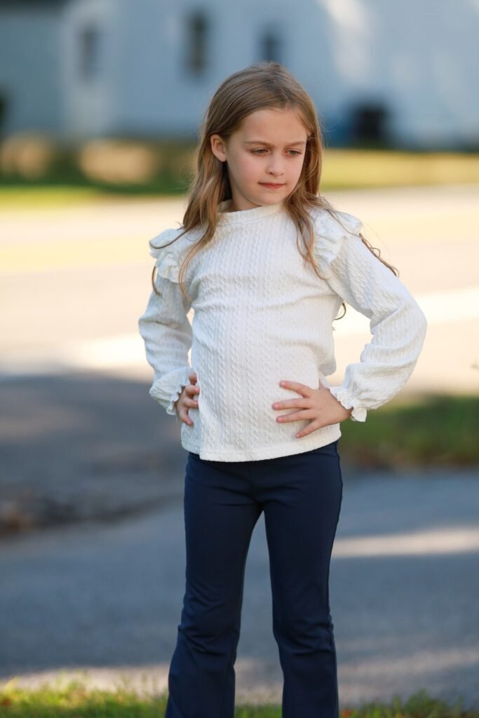 Description: This at-home outfit is cozy with a touch of elegance. A soft white sweater with delicate ruffle details feels special, while navy blue flared pants are a fun and comfortable alternative to standard sweatpants or leggings.