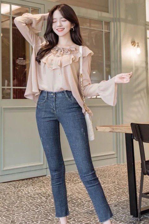 Description: This look is effortlessly chic and perfectly balanced. A romantic beige ruffled blouse adds texture and a touch of feminine drama. It is tucked into classic slim blue jeans for a sleek, casual base. Nude pointed heels elongate the legs and add a touch of elegance.