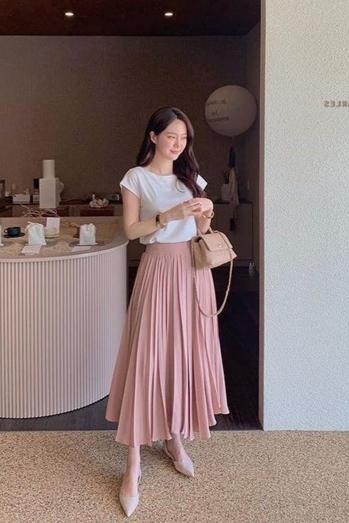 Description: This look is fresh, feminine, and effortlessly chic. A simple white cap-sleeve t-shirt is a classic, clean base. It is tucked into a beautiful pink pleated maxi skirt, which adds a soft pop of color and elegant texture. Beige pointed-toe flats complete this dreamy, everyday ensemble.