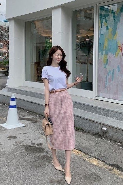 13. White Crewneck T-Shirt + Pink Plaid Pencil Skirt + Brown Skinny Belt + Beige Slingback Heels