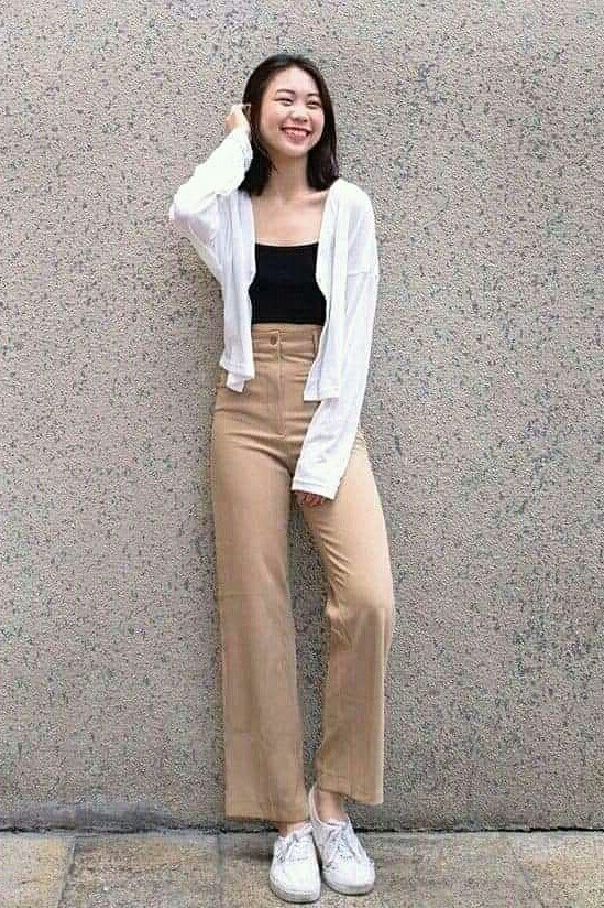 Pro Tip: The tan high-waisted trousers are the key to this look. They create a long, lean silhouette. The white cardigan and sneakers keep the look fresh and casual.