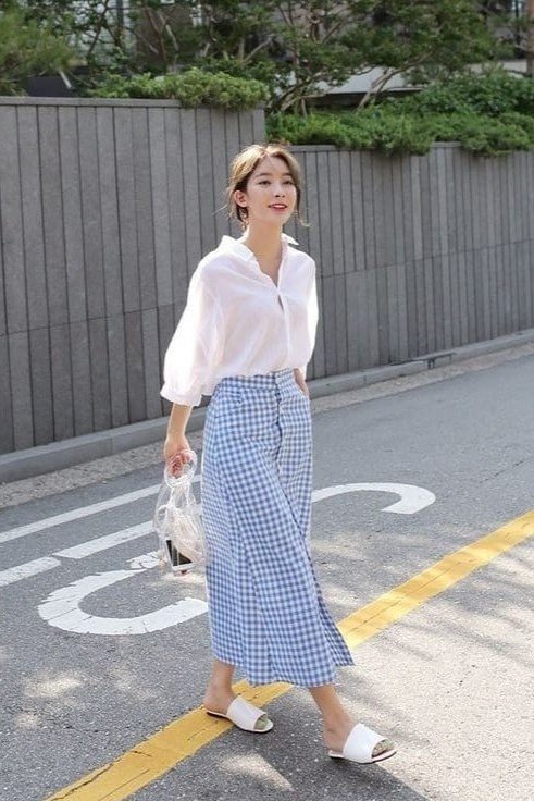 Description: This look is the epitome of sweet, romantic K-style. A delicate white puff-sleeve button-down is feminine and adds a touch of vintage charm. It is tucked into a cheerful blue gingham midi skirt, which adds a playful, classic print. White slide sandals complete this effortlessly cute ensemble.