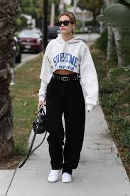 Cropped hoodies paired with high-waisted pants are comfortable yet stylish. Sneakers complete the sporty look. For midsize women, this combo works well because it defines the waist without being too fitted. Great for casual weekends, travel, or lounging.