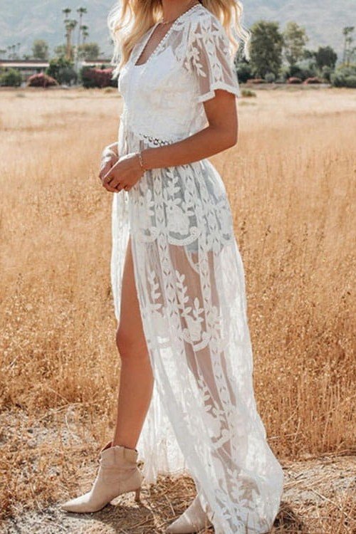 11. White Lace Maxi Kimono + Denim Shorts + Beige Suede Ankle Boots