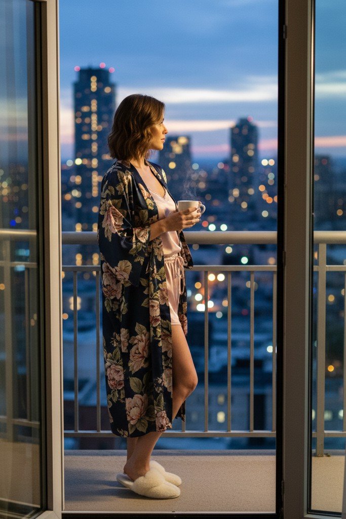 Description: For the ultimate in-room relaxation, pack a beautiful silk or floral print kimono robe. Wear it over a matching or coordinating silk pajama set (shorts or pants). Bring cozy slippers or socks.