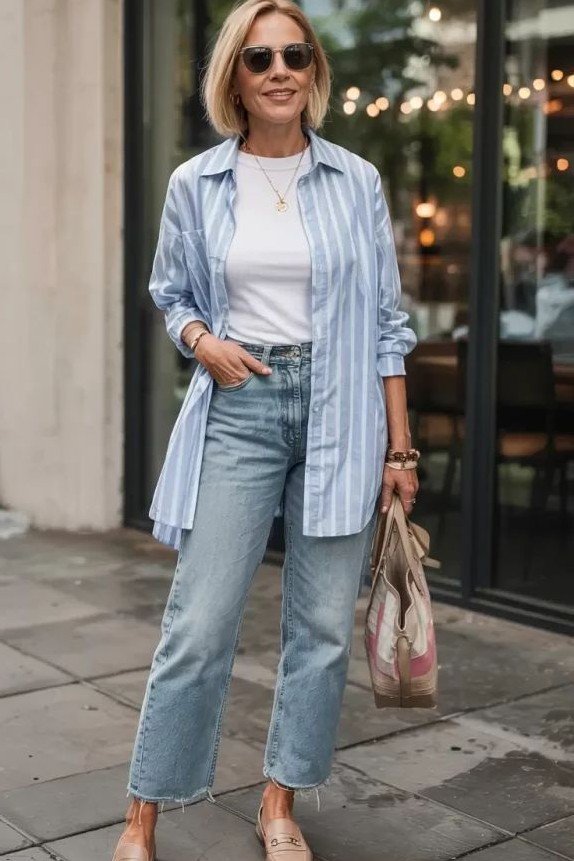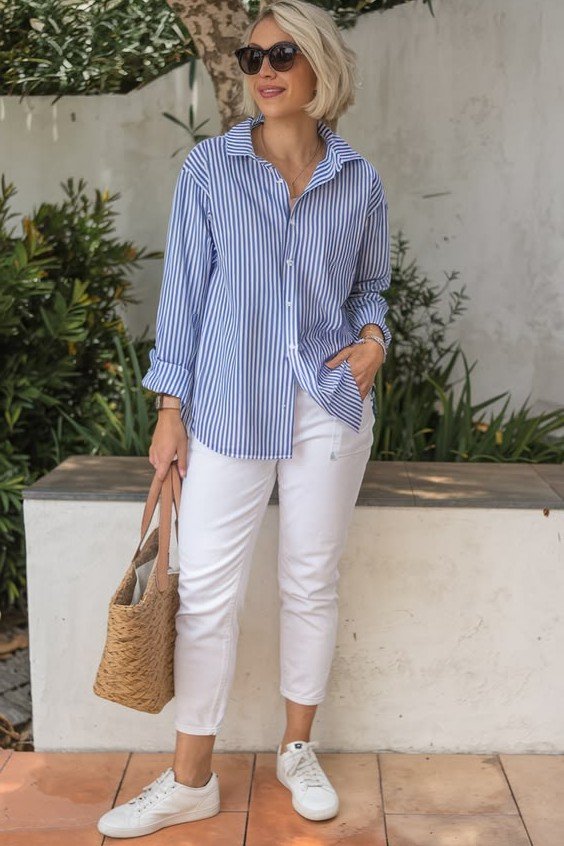 3. Blue and White Striped Oversized Shirt + White Cropped Jeans + White Sneakers