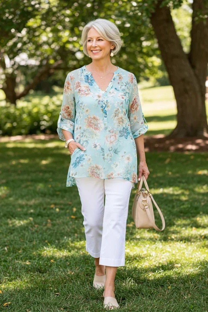 Pro Tip: Look for a blouse with a small scale floral print. It reads more sophisticated than large flowers. Add a thin gold necklace to frame your face.