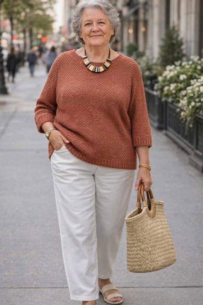 Description: A rust colored textured knit sweater adds warmth and color. Pair it with white straight leg pants and easy beige slide sandals. The texture of the sweater makes the outfit interesting.