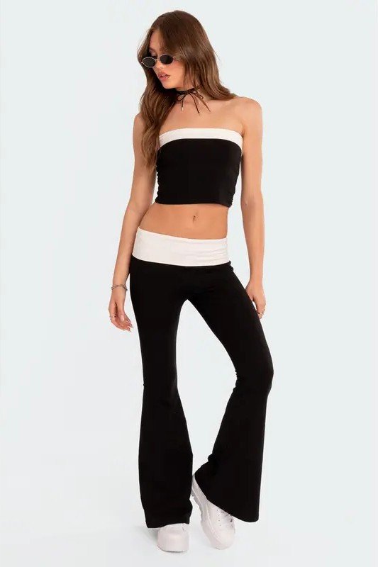 Pro Tip: The tube top should fit snugly so you can move with confidence. The black fold-over flare pants create a seamless line from waist to hem. Add a pair of simple hoop earrings to complete this casual, chic look.