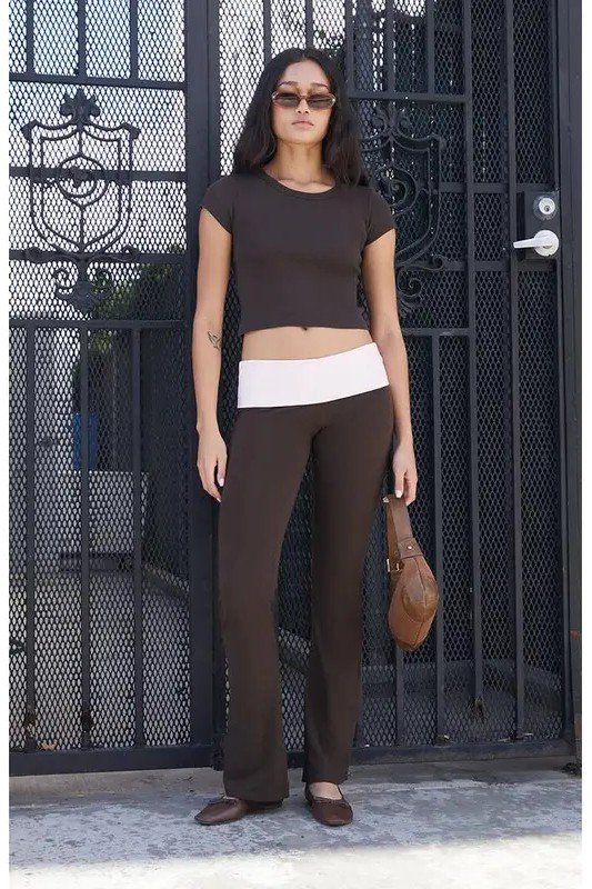 5. Dark Brown Short Sleeve Crop Top + Dark Brown Fold-over Flare Pants + Brown Ballet Flats