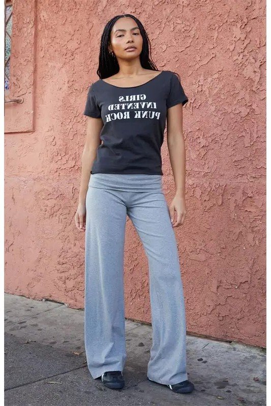 8. Grey “Girls Invented Punk Rock” Graphic Tee + Heather Grey Wide Leg Pants + Black Sneakers