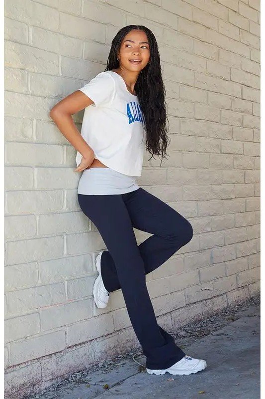 7. White “Amalfi” Graphic Tee + Dark Navy Fold-over Flare Pants + White Sneakers