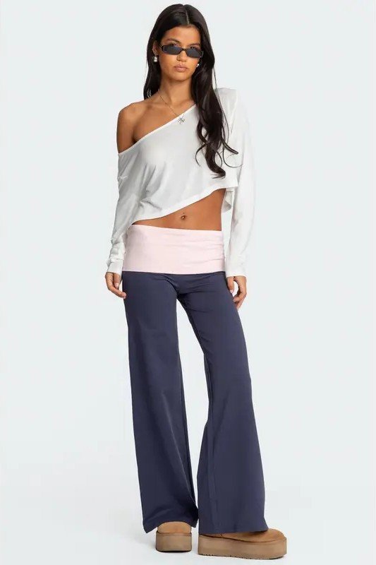 2. White Off-the-shoulder Long Sleeve Top + Navy Blue Fold-over Wide Leg Pants + Tan Platform Boots