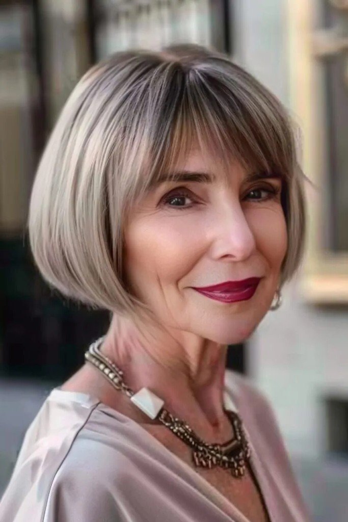 Why It Works: The straight fringe hides forehead lines and frames your eyes. The salt and pepper color is naturally dimensional and requires no maintenance. This cut works on straight hair that can hold a blunt line. It is perfect for women who want a bold, architectural look.