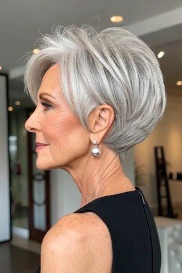 Why It Works: The deep side part creates volume at the crown instantly. The structured silver layers are modern and chic. This cut works on straight hair that can hold a sleek finish. It is perfect for women who want a polished, put together look.
