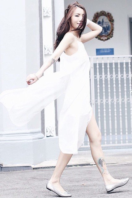 20. White Crop Top + White Maxi Skirt + Grey Sweater Over Shoulders + Silver Ballet Flats