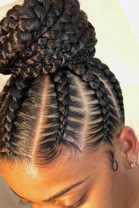 6. Chunky Feed-in Braids Styled into a Jumbo High Top Knot Bun