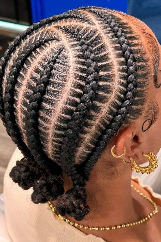Pro Tip: The curved cornrows should follow the natural curve of your head. Braid the ends into a thick braid, then wrap it into a bun. Pull the bun gently to make it voluminous. Use bobby pins that match your hair color.