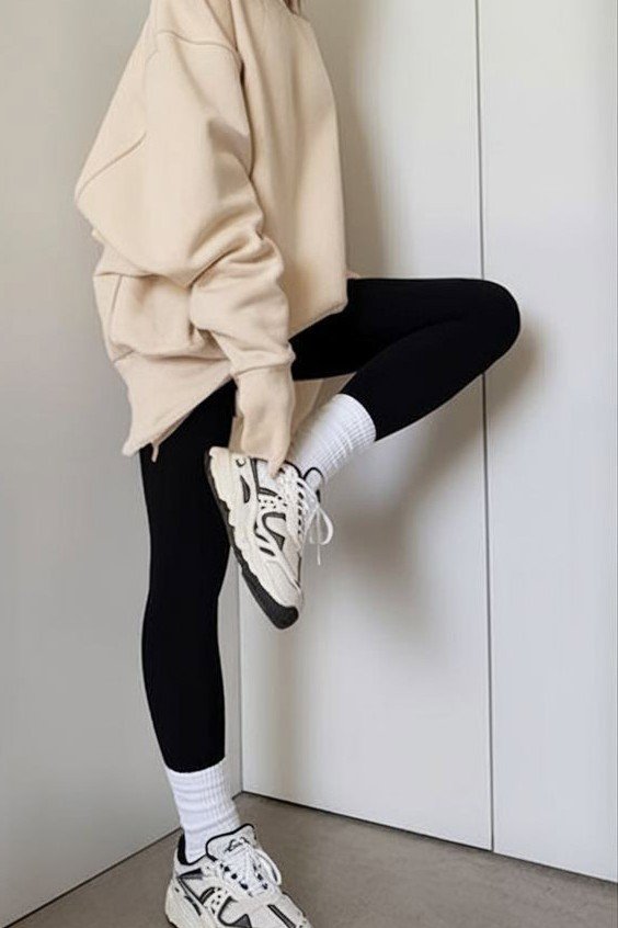 26. Cream Oversized Sweatshirt + Black Leggings + White and Black Chunky Sneakers