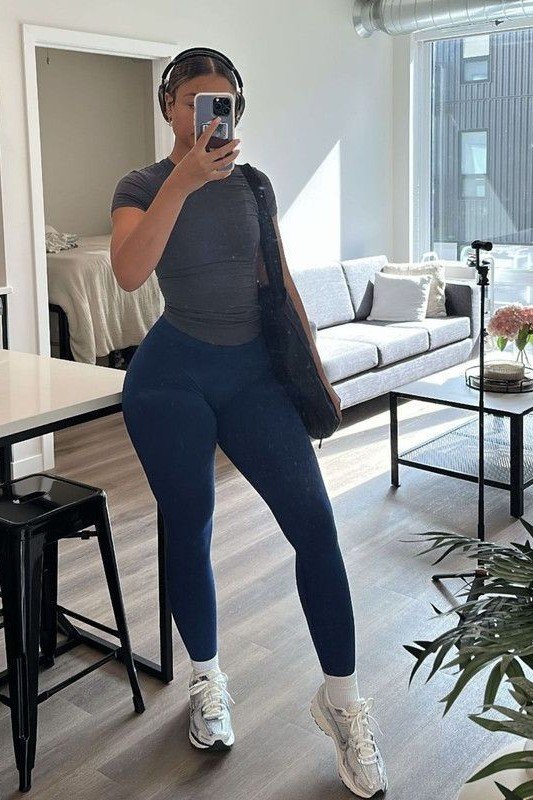A classic gym uniform, elevated. The slim fit grey tee is simple and breathable, paired with dependable navy leggings. The silver accented sneakers add a subtle, futuristic sparkle to this otherwise grounded outfit.