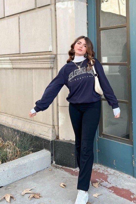 Casual, cool, and perfect for a relaxed day. A graphic sweatshirt adds personality, while black flared pants are a trendy alternative to leggings. White sneakers keep it clean and classic.