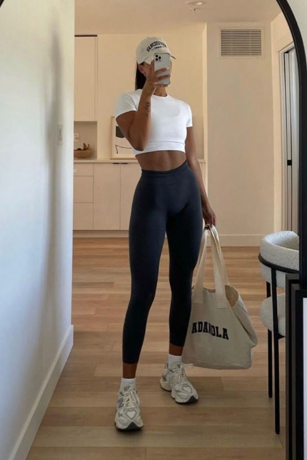Sporty and fresh, this outfit is perfect for a warm day. The white crop top is breezy and cute, contrasted with dark grey leggings for balance. The white cap and sneakers create a cohesive, bright look.