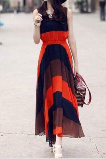 Description: This look is a bold, artistic statement perfect for a summer day. A stunning black, orange, and brown color-block maxi dress is unique and eye-catching. The warm color palette is perfect for summer. Paired with white wedges and a striped handbag, this outfit is playful, stylish, and full of personality.
