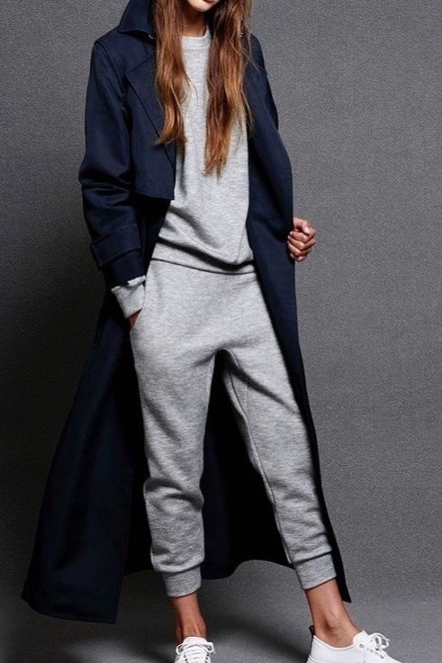 5. Navy Long Trench Coat + Heather Grey Sweatshirt + Heather Grey Joggers + White Low-Top Sneakers