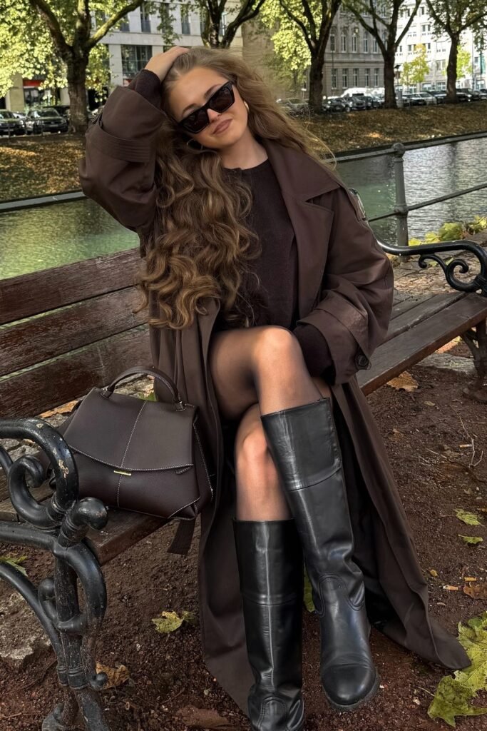 Description: A classic and timeless outfit that never fails. The brown-on-brown layering is chic and sophisticated. The trench coat provides a polished finish, while straight-leg jeans keep it modern and comfortable.