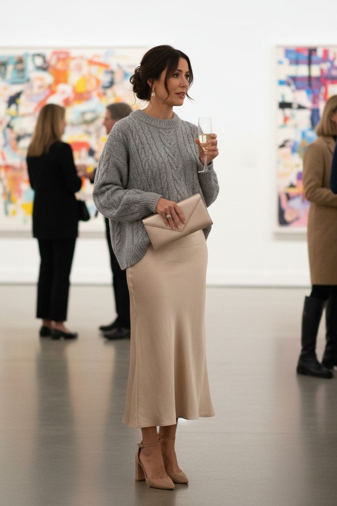 This outfit balances feminine and cozy elements. A sleek satin or silk midi slip skirt is elegant and fluid. A contrasting chunky knit sweater on top adds texture and warmth. Delicate ankle strap heels lengthen the legs and add a dressy finish.