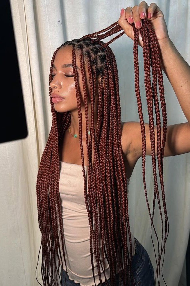 Description: This bold style features copper red knotless braids with precise, clean square partings. The braids are medium length and uniform in size. You will need a rattail comb and edge control. The vibe is bold, fiery, and very confident.
