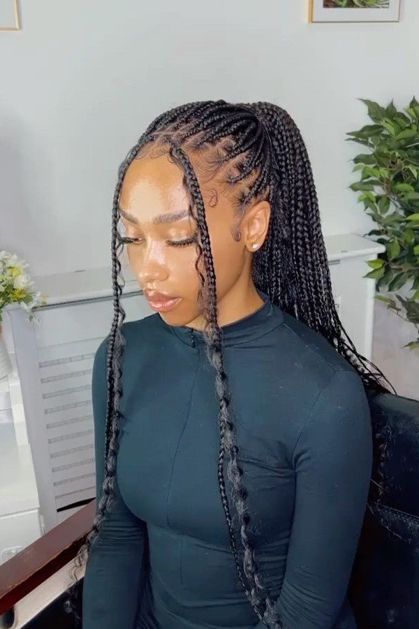 Description: This detailed style features feed in cornrows that curve and swirl at the hairline. The cornrows continue into knotless braids down the length. You will need a rattail comb, edge control, and braiding gel. The vibe is artistic, intricate, and very sophisticated.
