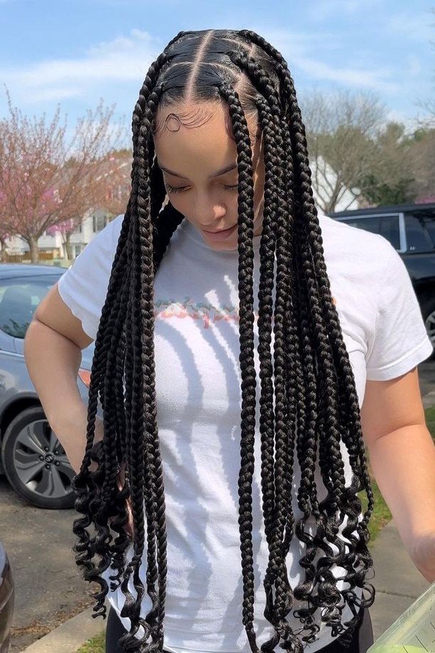 2. Jumbo Box Braids with Curled Ends and Laid Edges