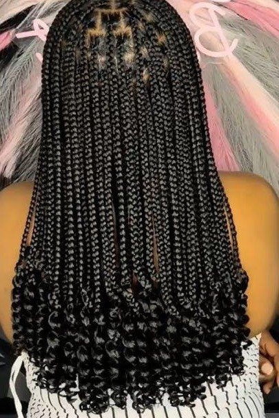 Description: This bohemian style features extra long knotless braids that reach waist length or longer. The ends are left curly and loose using human hair or curly extensions. You will need curling mousse and a satin bonnet. The vibe is boho, romantic, and very free spirited.