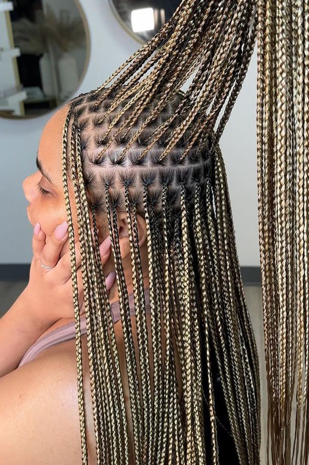 Pro Tip: The ombré should transition gradually. Ask your braider to blend the dark and blonde hair together for a seamless fade. Use a purple shampoo on the blonde ends once a week to prevent brassiness. Keep your square parts sharp with a rattail comb.